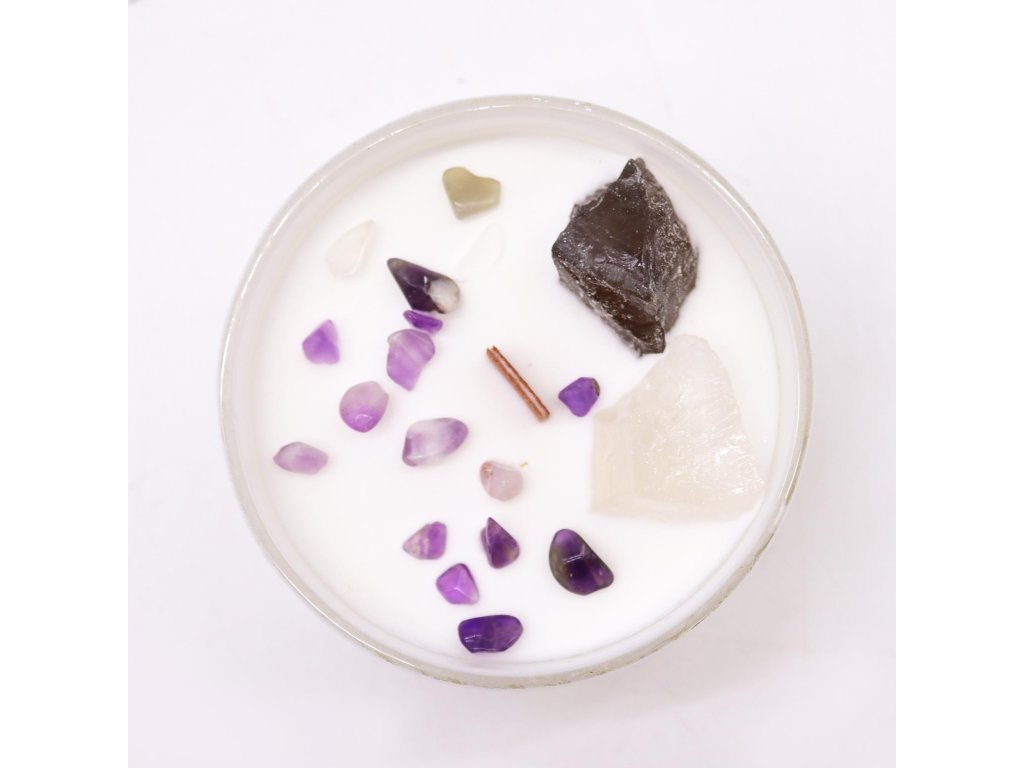 Obsahuje prírodné drahé kamene, ako napríklad ametyst a selenit, ktoré sú tradične spájané s pokojom, očistením a duchovným prepojením. Každá sviečka je originál – rozloženie kameňov sa môže mierne líšiť.