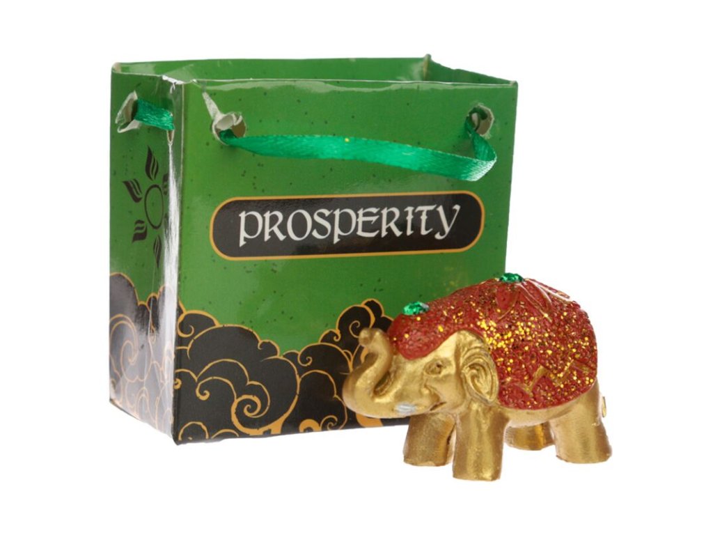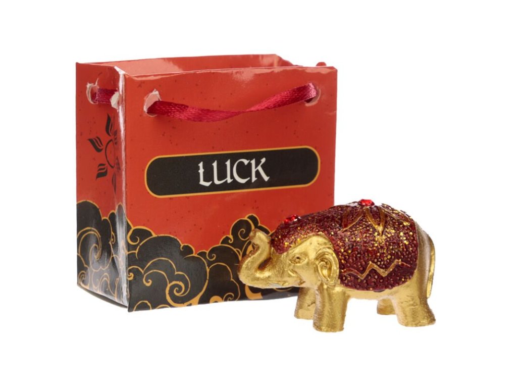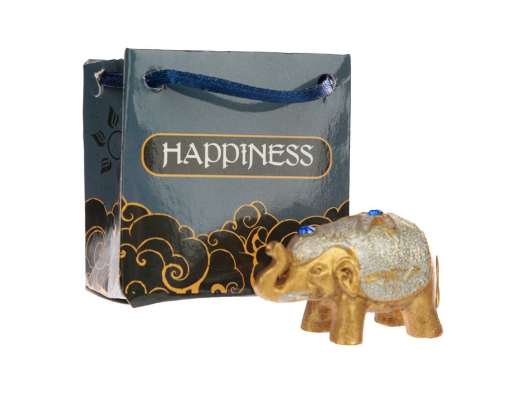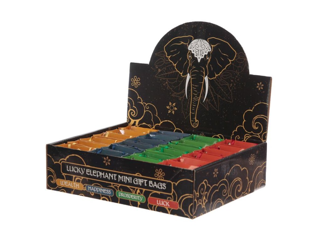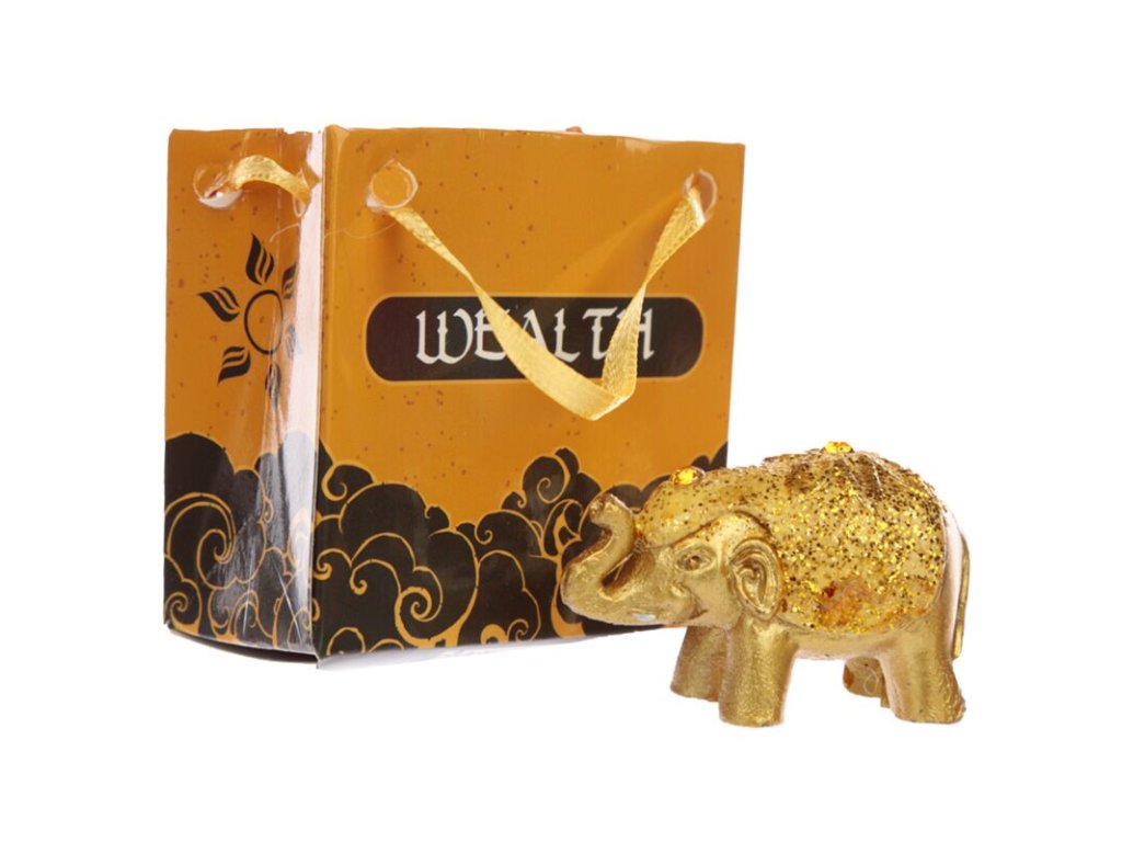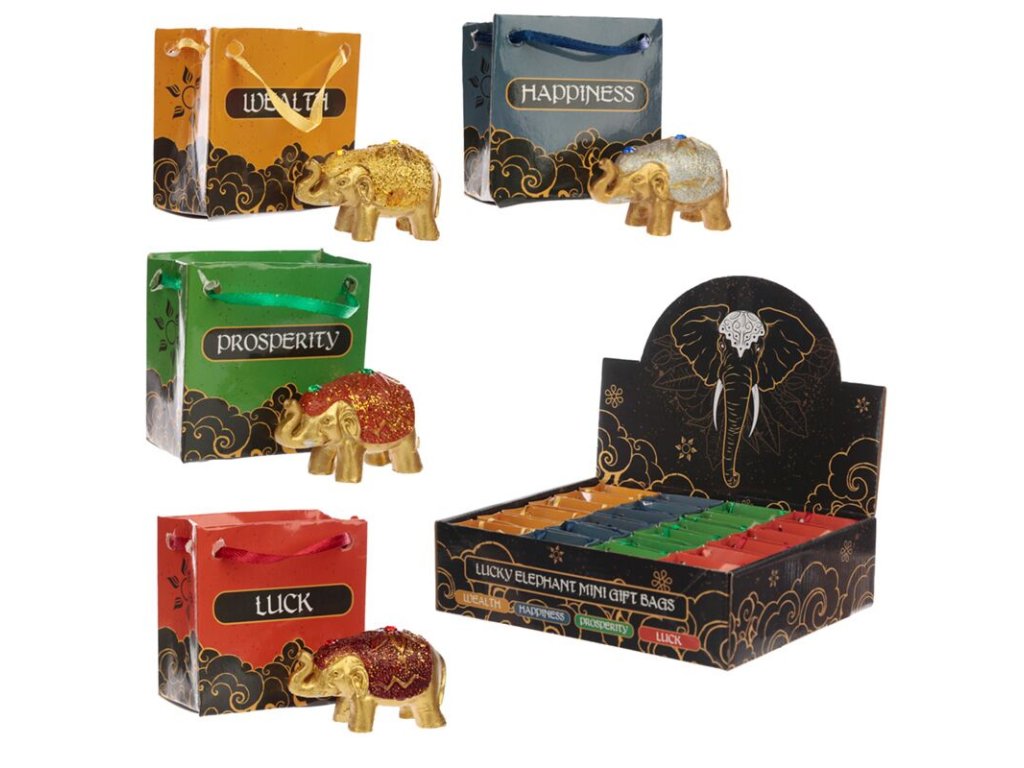 Každý sloník je uložený v elegantnej darčekovej taštičke s tematickým nápisom – Wealth (Bohatstvo), Happiness (Šťastie), Prosperity (Prosperita) alebo Luck (Šťastena).