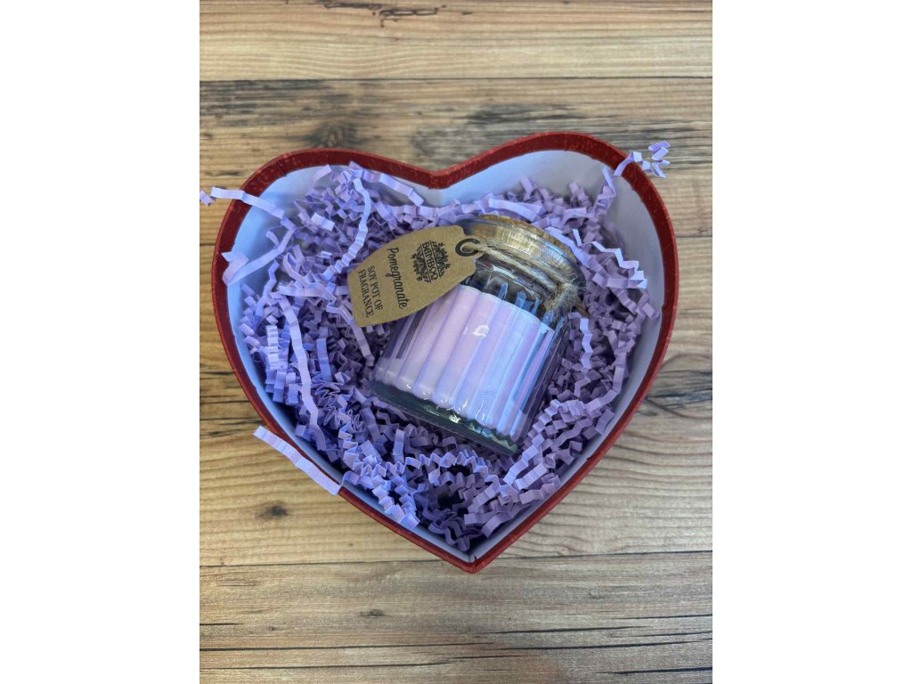 Štýlový darčekový box v tvare srdca, vystlaný jemnou fialovou dekoratívnou výplňou. Vo vnútri sa nachádza kvalitná sójová sviečka s vôňou granátového jablka v sklenenom pohári. Krásny a voňavý darček vhodný na každú príležitosť – poteší, prekvapí a vytvorí príjemnú atmosféru.