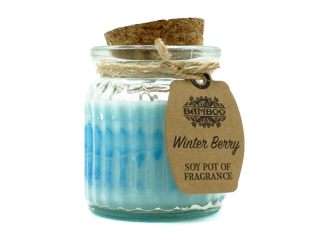 Vlastnosti: vôňa: Winter Berry – kombinácia sladkých bobúľ a zimnej sviežosti vyrobená zo 100 % prírodného sójového vosku ekologická a netoxická – horí čistejšie a dlhšie než parafín dodávaná v sklenenej nádobe s korkovým viečkom a rustikálnym príveskom ideálna na zimné večery alebo ako vkusný darček.