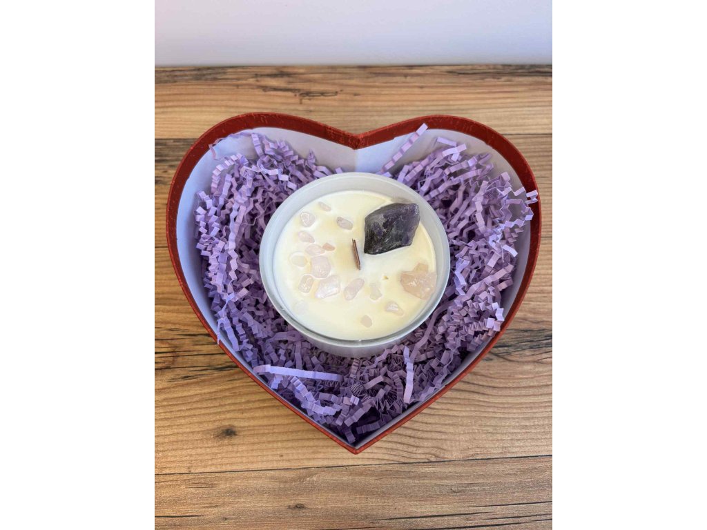 Romantický darčekový box v tvare srdca, vystlaný jemnou fialovou výplňou. Obsahuje ručne robenú sviečku s dreveným knôtom, ozdobenú prírodnými kryštálmi. Ideálny darček na Valentína, výročie, pre milovanú osobu alebo ako relaxačný wellness balíček.