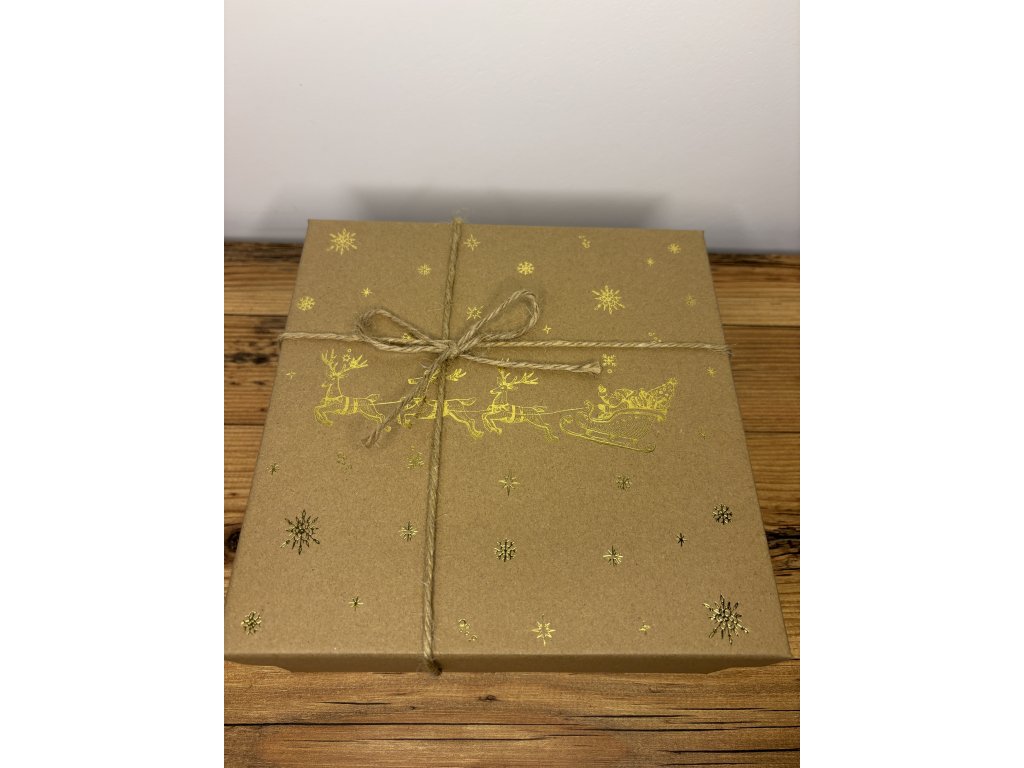 Všetko zabalené v krásnej vianočnej krabičke so zlatou potlačou a jutovou mašľou.